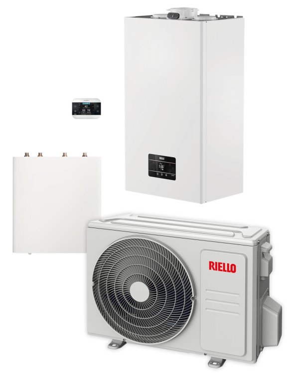 RIELLO ADAPTO HYBRID è la soluzione ibrida residenziale factory made, ideale nella sostituzione degli impianti esistenti, che si inserisce nel percorso di transizione energetica a cui Riello prende attivamente parte. È un sistema multi-energia compatto e versatile, costituito della pompa di calore RIELLO ADAPTO da 3.5 o 5.0 kW in R32, il kit idraulico HYBRID, la caldaia a condensazione START in versione combinata da 25 o 30 kW e l’evoluto system manager HI, COMFORT T300-HY.
