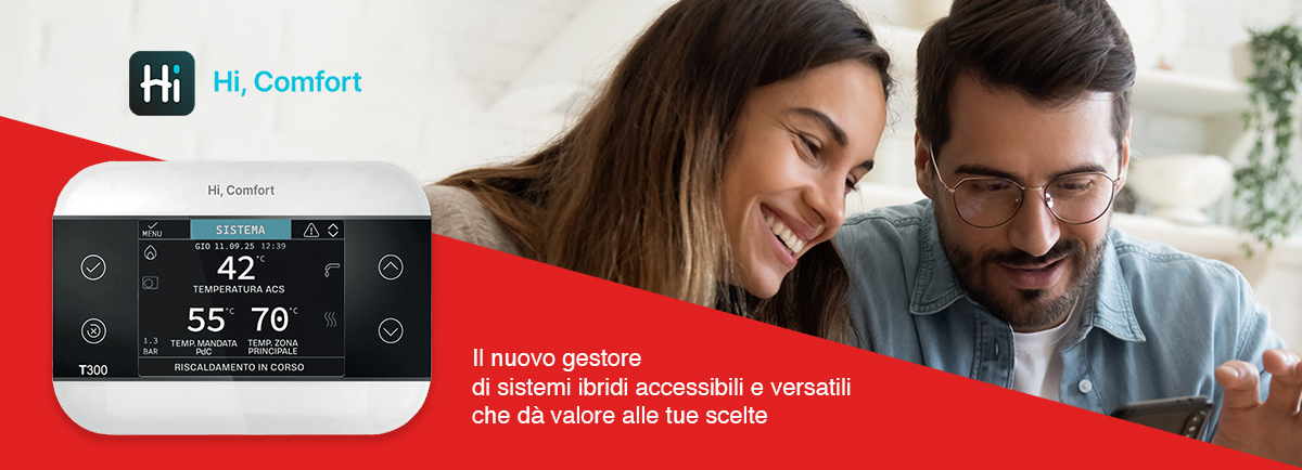 Gestione efficiente di molteplici fonti energetiche: Hi, Comfort T300-Hy è il vero cervello del sistema consentendo un funzionamento intelligente della caldaia e della pompa di calore volto al raggiungimento del costo minimo di esercizio.