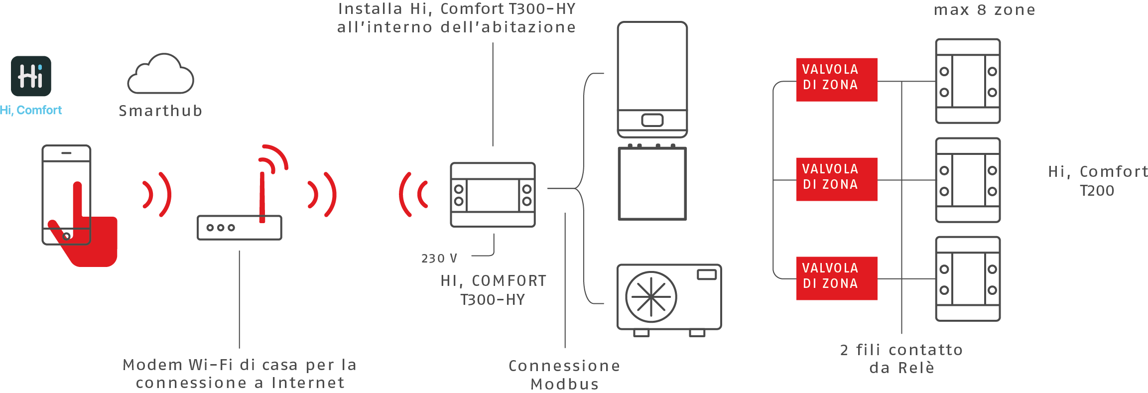 Hi, Comfort T300-Hy combina le funzioni di termostato per la zona principale dell’abitazione, di gestore d’impianto per i sistemi di generazione di riscaldamento e raffrescamento, e di gateway per l’accesso a internet, permettendo l’utilizzo di Hi, Comfort app.